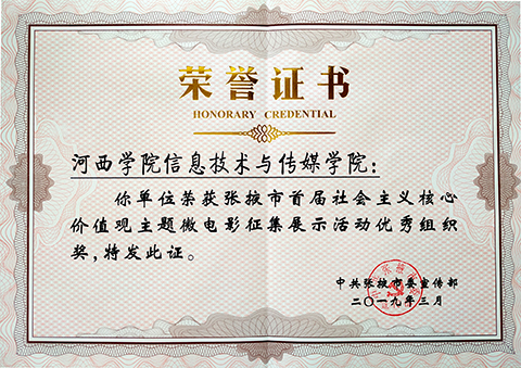 据悉,为深入学习贯彻习近平新时代中国特色社会主义思想和党的十九大精神,庆祝改革开放40周年,聚焦张掖市广大干部群众践行社会主义核心价值观的生动实践, 2018年张掖市在全国范围内开展了首届社会主义核心价值观主题微电影作品征集展示活动,共征集到来自省内外的核心价值观主题微电影、微视频、微动漫等作品105件,经相关部门组织专家评选,共有31件微电影、微视频、微动漫作品获得奖励,5个单位获得优秀组织奖。