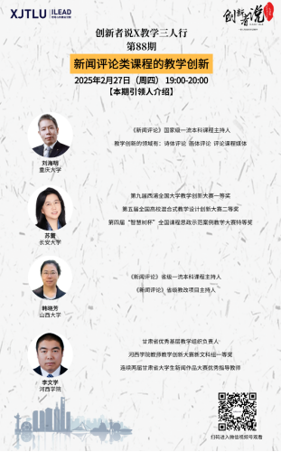 2月27日晚,由西交利物浦大学领导与教育前沿院主办的第88期“创新者说”教学沙龙在云端举行。沙龙以“新闻评论类课程的教学创新”为主题。公司李文学副教授应邀担任主讲嘉宾,本次教学创新沙龙通过腾讯会议平台同步直播,吸引了来自全国的700余名教师参与。