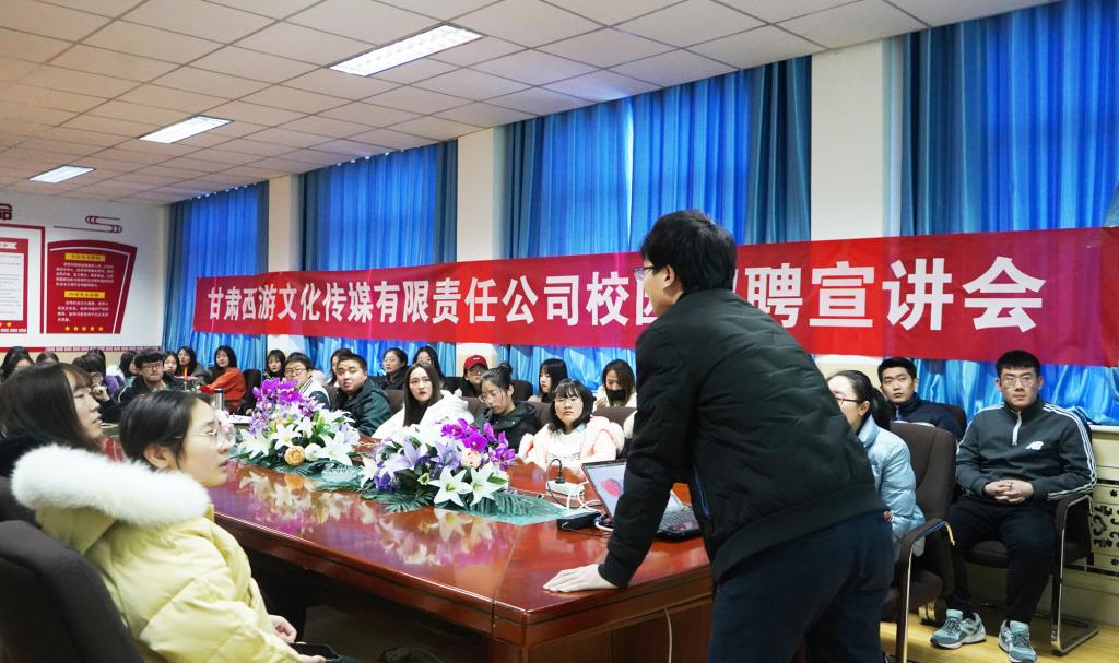 会上,甘肃西游文化传媒有限责任公司负责人介绍了关于我们、企业文化、工作环境、招聘岗位、薪资待遇、员工培养发展前景等情况,并重点介绍了本次企业校园招聘计划。随后,同学们也就普遍关注的福利政策、工资薪酬、晋升机制、发展空间等细节问题进行了详细咨询和互动交流。